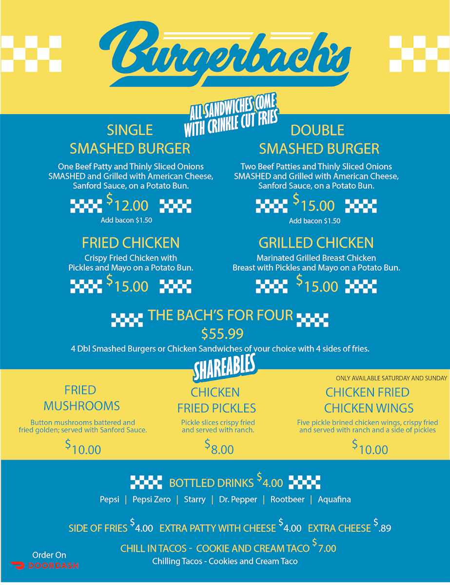 From a reviewer’s perspective, Burgerbach’s menu brings together a compact but satisfying range of comfort-food staples, highlighted by standout burgers like the Double Smashed Burger, Single Smashed Burger, and the smoky richness of the Bacon Dbl Smash Burger and Bacon Single Smashed Burger. For guests seeking fuller meals, the combo selections-such as the Double Smashed Burger Combo, Bacon Double Smashed Burger Combo, and the chicken-focused Pickle Brined Grilled Chicken Sandwich Combo and Pickle Brined Fried Chicken Sandwich Combo-offer good value while maintaining the same bold flavors. The “Football Favorites” section adds fun, heartier options like the Dbl Blitz Burger Combo, Dbl Blitz Burger, and the spicy Hot Route Fried Chicken Sandwich with its combo counterpart, alongside the seasoned Old Bay Fries. Chicken lovers can also choose between the Pickle Brined Grilled Chicken Sandwich and Pickle Brined Fried Chicken Sandwich, both of which stay true to the restaurant’s brined-and-crispy theme. Shareables such as Fried Pickles, Crinkle Cut Fries, and Fried Mushrooms round out the savory offerings with classic textures and crowd-pleasing appeal. Guests can pair their meals with simple drink options like Coke Zero (12oz), Dasani (12oz), Coca-Cola (12oz), and Sprite (12oz). For a sweet finish, the Cookies And Cream Ice Cream Taco and Strawberry Shortcake Ice Cream Taco add a playful twist to dessert. Overall, Burgerbach’s menu balances familiar comfort food with a few creative touches, making it a satisfying stop for burger enthusiasts and casual diners alike.